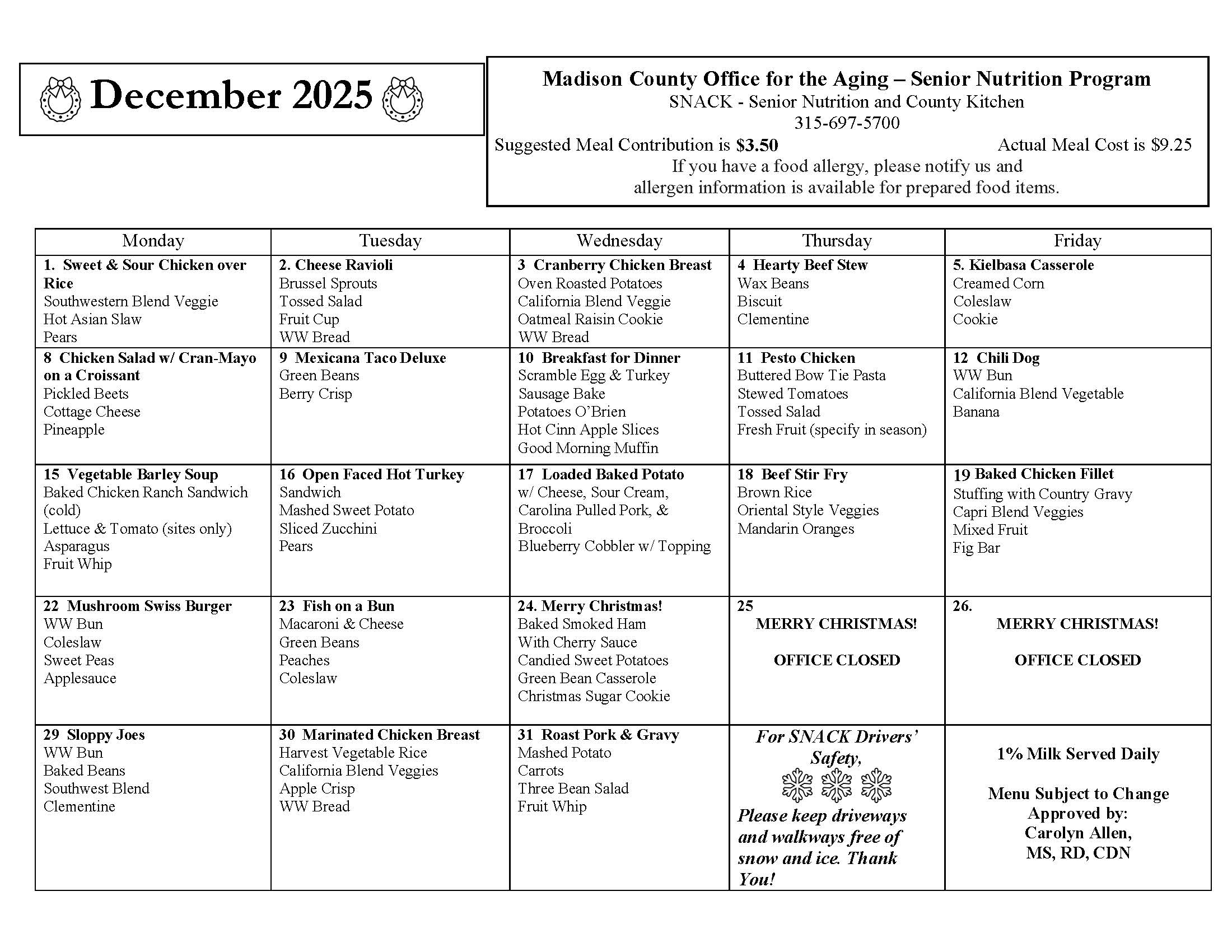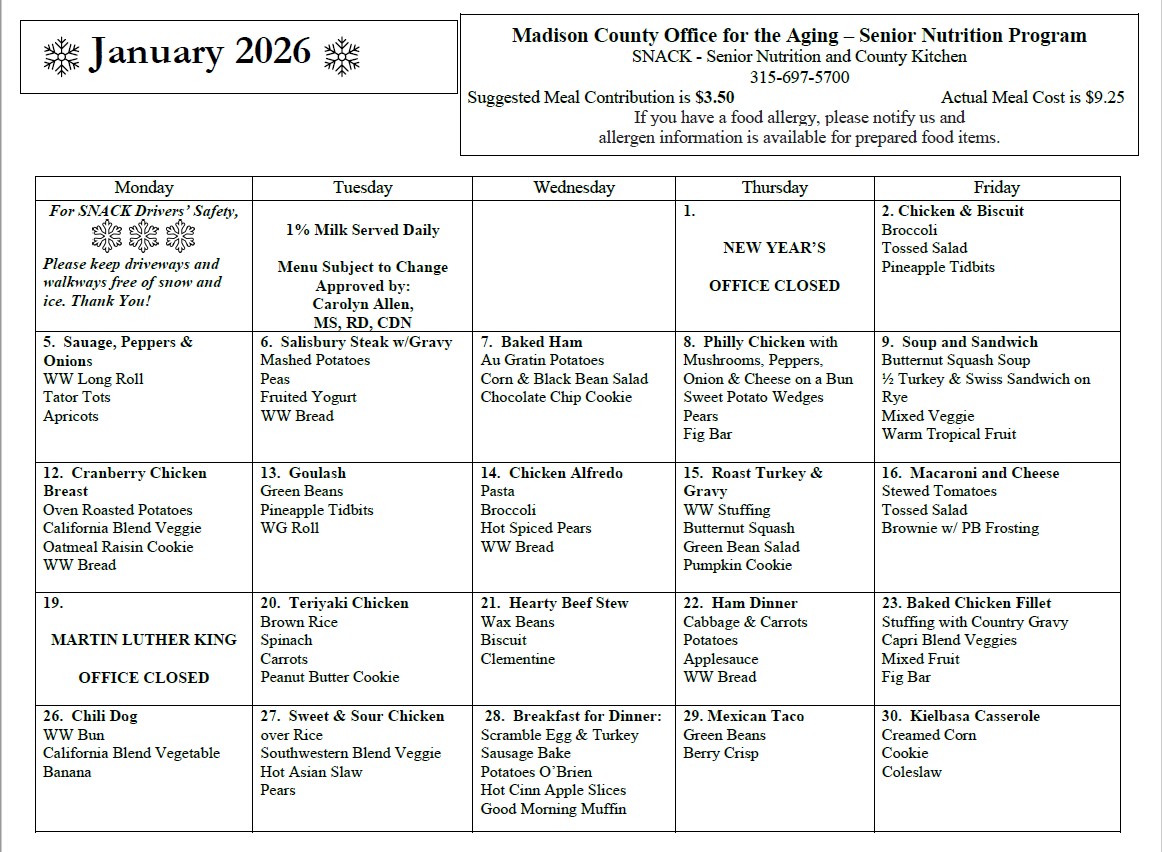 SNACK site- In addition to a nutritionally balanced meal, congregate sites offer a friendly atmosphere and the opportunity to join a variety of social, educational and recreational activities. These meal sites are located throughout the county and meet for noontime lunch provided by our Central Kitchen. Grab & Go option is also available for those do not want to eat at the site.